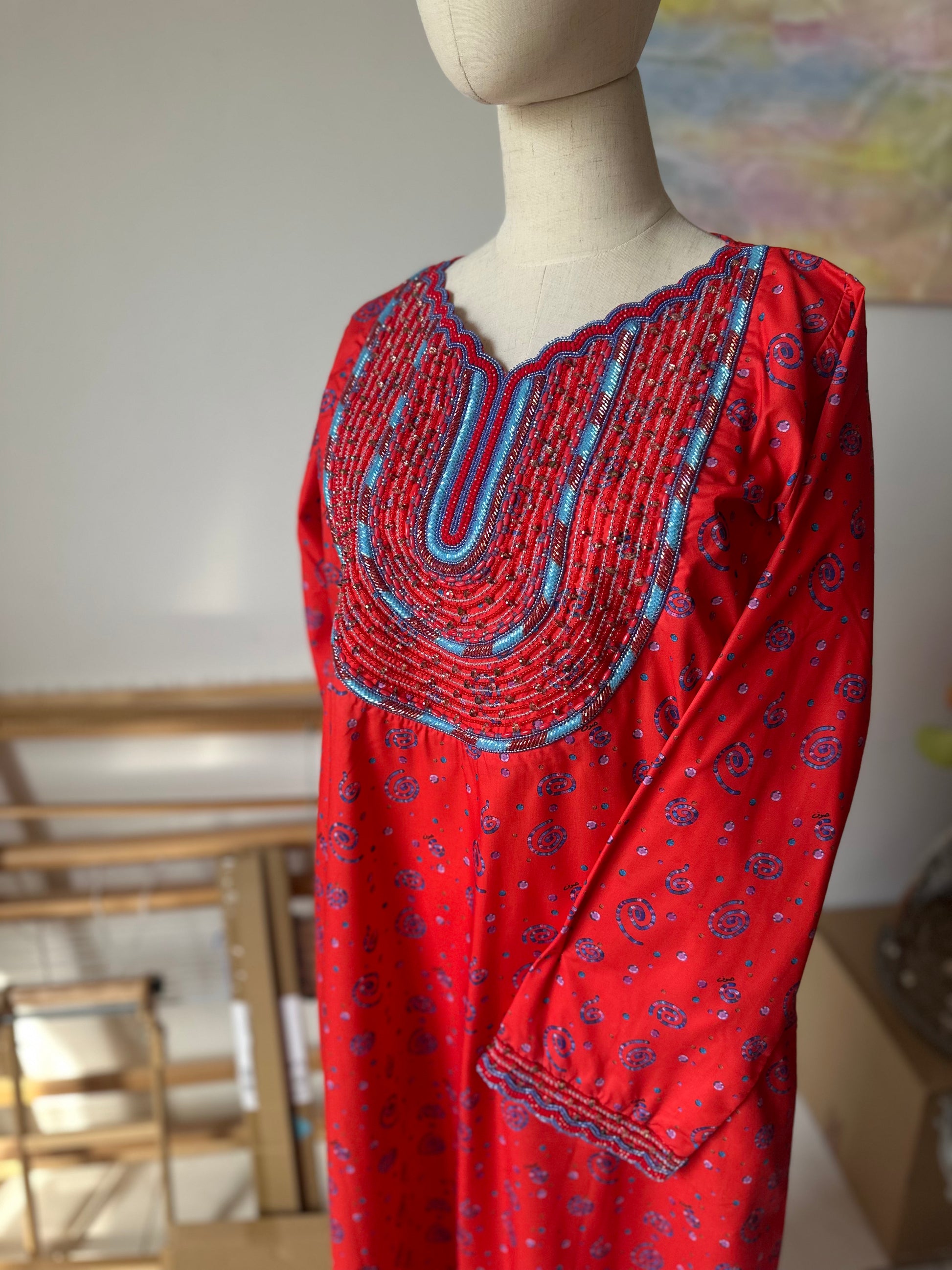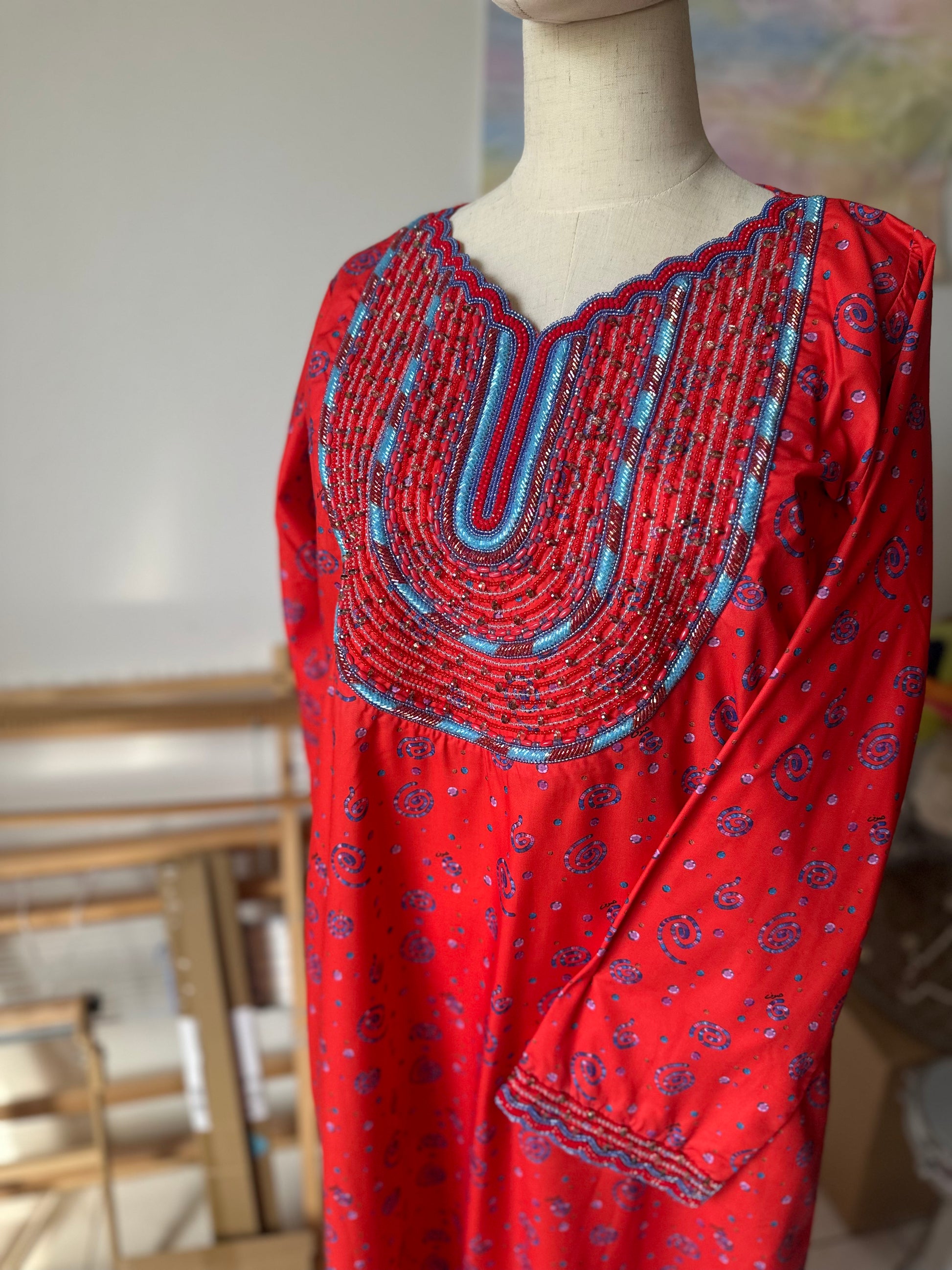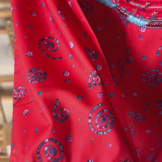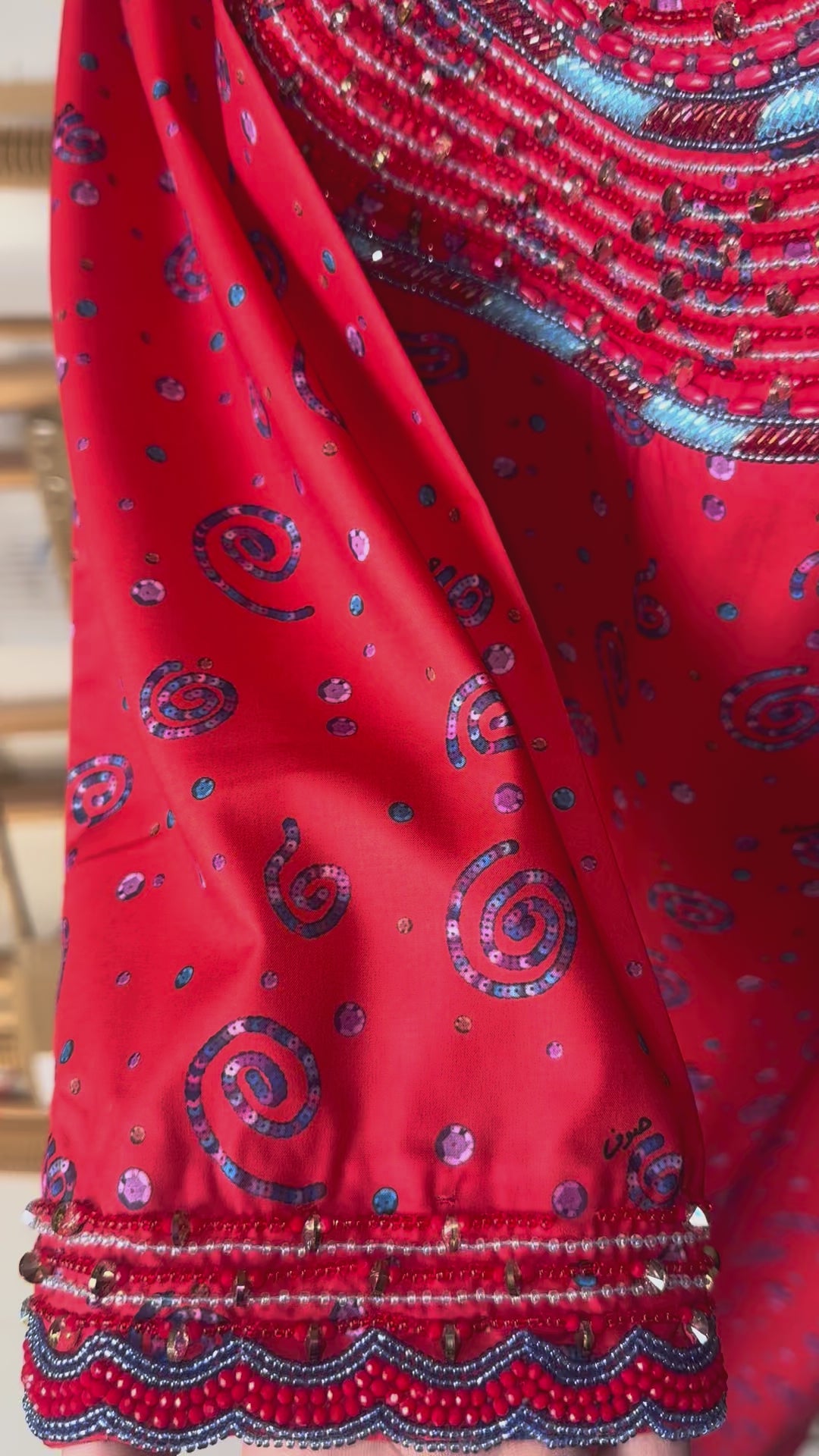 Bring a touch of whimsy to your wardrobe with the Snail in Rouge jalabya from Soof Studio. Adorned with swirling sequin designs that sparkle and dance, this piece captures the playful spirit of Soof Studio perfectly. Its unique sequin patterns add just the right amount of shimmer to brighten any occasion.