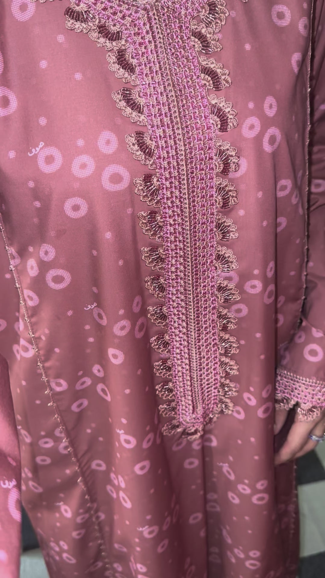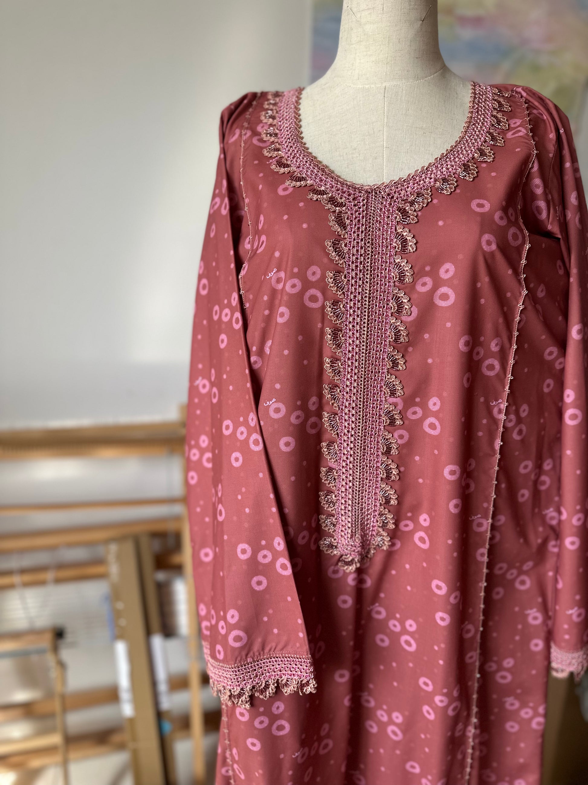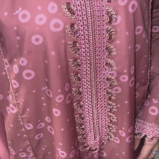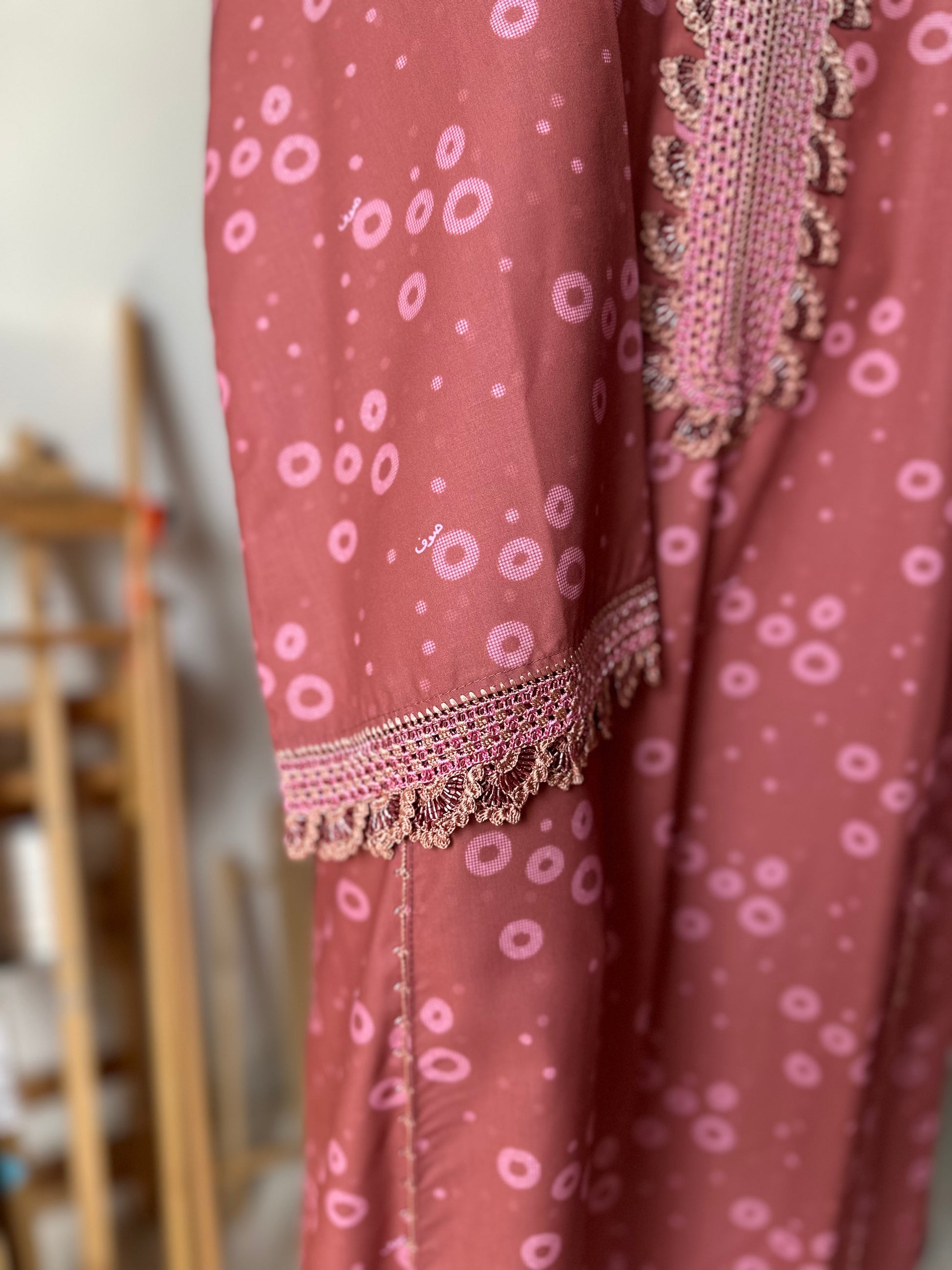 Experience playful elegance with Soof Studio design—a delightful blend of chocolatey brown and Barbie pink, enhanced with charming crochet details. This fabric brings a fun, textured twist to your creative look, perfect for any day.